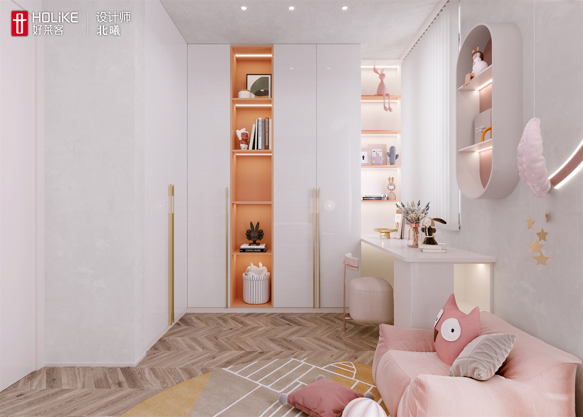 ▲沿墙设计大容量衣柜,肉桂粉开放格作为点缀,一抹亮色让空间颜值飙升。藏露结合的柜体设计轻松收纳女孩的玩偶、衣物,配置出赏心悦目的“童话世界”。