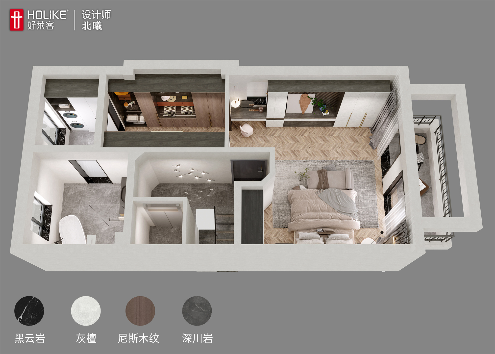 ▲黑云岩背板和雅尼斯木纹衣柜时尚高级,无处不彰显着黄先生的高品质生活态度。