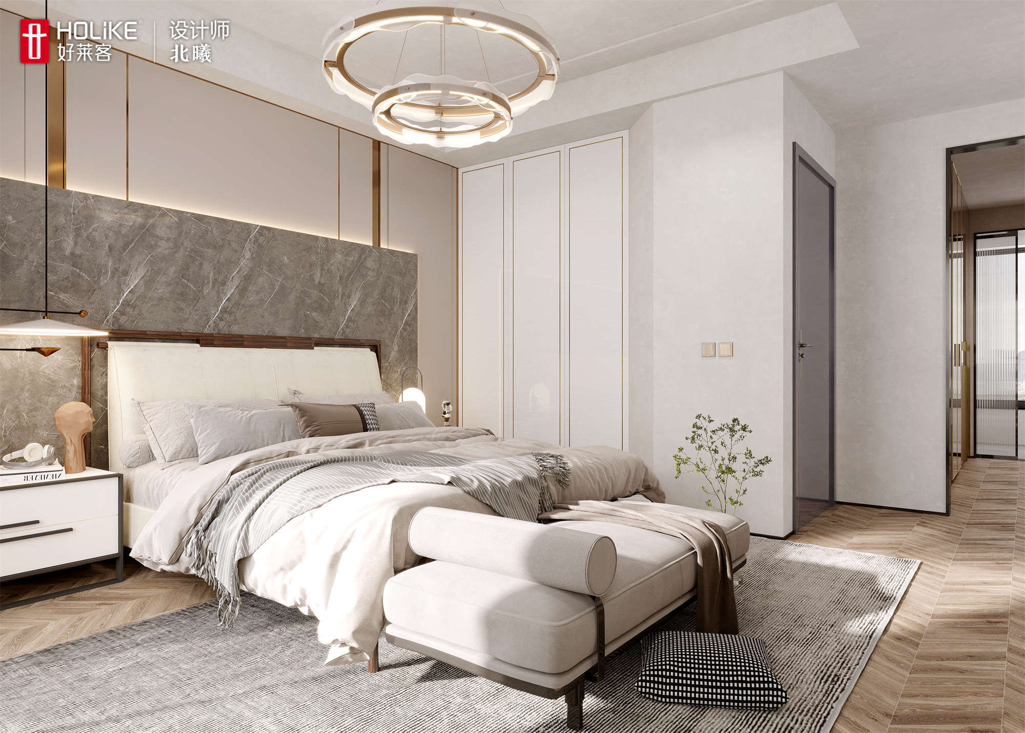 ▲浅色系的主卧舒缓雅致,深川岩背板和黄铜色竖线装饰把轻奢和新中式的设计风格完美糅合。