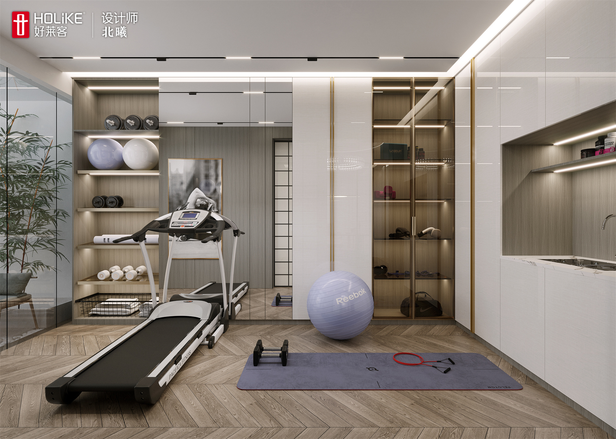 ▲健身房设计整墙储物柜,尽可能利用墙面空间垂直收纳各种器具,再多的运动器材也能整理得井井有条。